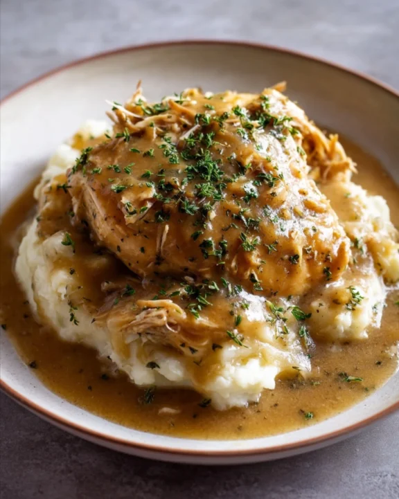 • Instant Pot: You can make this dish in an Instant Pot for a quicker option. Use the sauté function to brown the chicken first, then add the gravy ingredients. Cook on high pressure for about 10-15 minutes, and let it naturally release for 10 minutes before shredding.