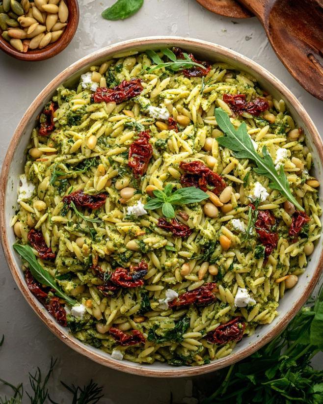 A delightful salad featuring creamy dairy-free pesto, orzo pasta, and sun-dried tomatoes, perfect for any occasion.