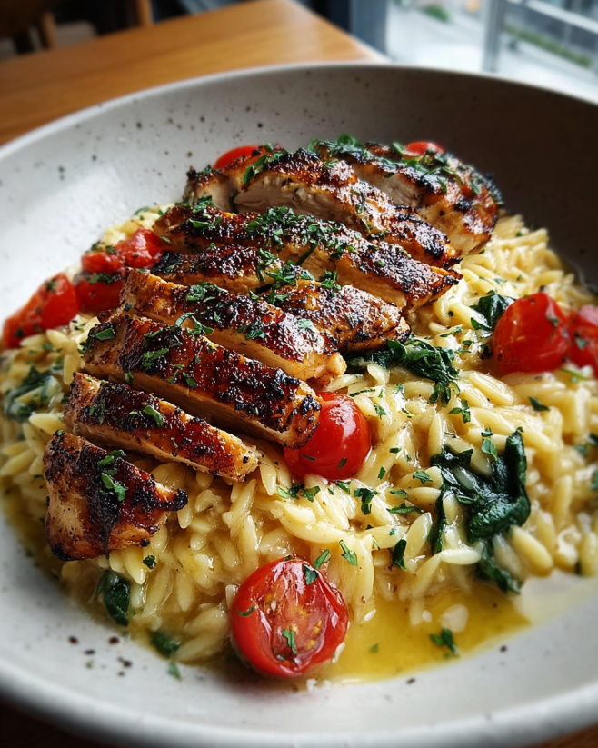 A delightful dish that combines the bright flavors of lemon and fresh herbs with tender chicken, savory orzo pasta, and vibrant vegetables.