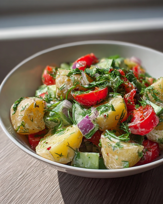 A refreshing salad that combines tender baby potatoes, peppery arugula, sweet cherry tomatoes, briny Kalamata olives, and creamy feta cheese, all tossed in a light dressing.